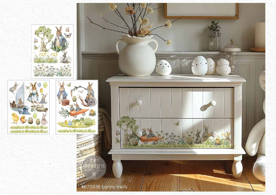 Add these charming designs to furniture, trays, or Easter decor to bring a fresh and joyful touch to your home. Imagine a sweet bunny scene on a child’s toy chest or a festive centerpiece for your Easter table—this transfer makes it all possible.
